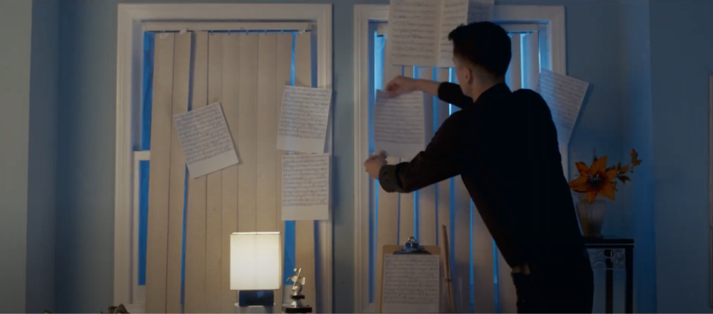 Nield uses color to differentiate and define the two worlds. Warm tones dominate the composer’s environment, grounding it in familiarity, while cooler, harsher hues establish the counterpart world, signaling unease and psychological dislocation. These shifts are gradual and carefully controlled, allowing the audience to perceive emotional change without dialogue or exposition. By sustaining mood across the frame, color becomes a tool for guiding emotional response and marking subtle narrative shifts.